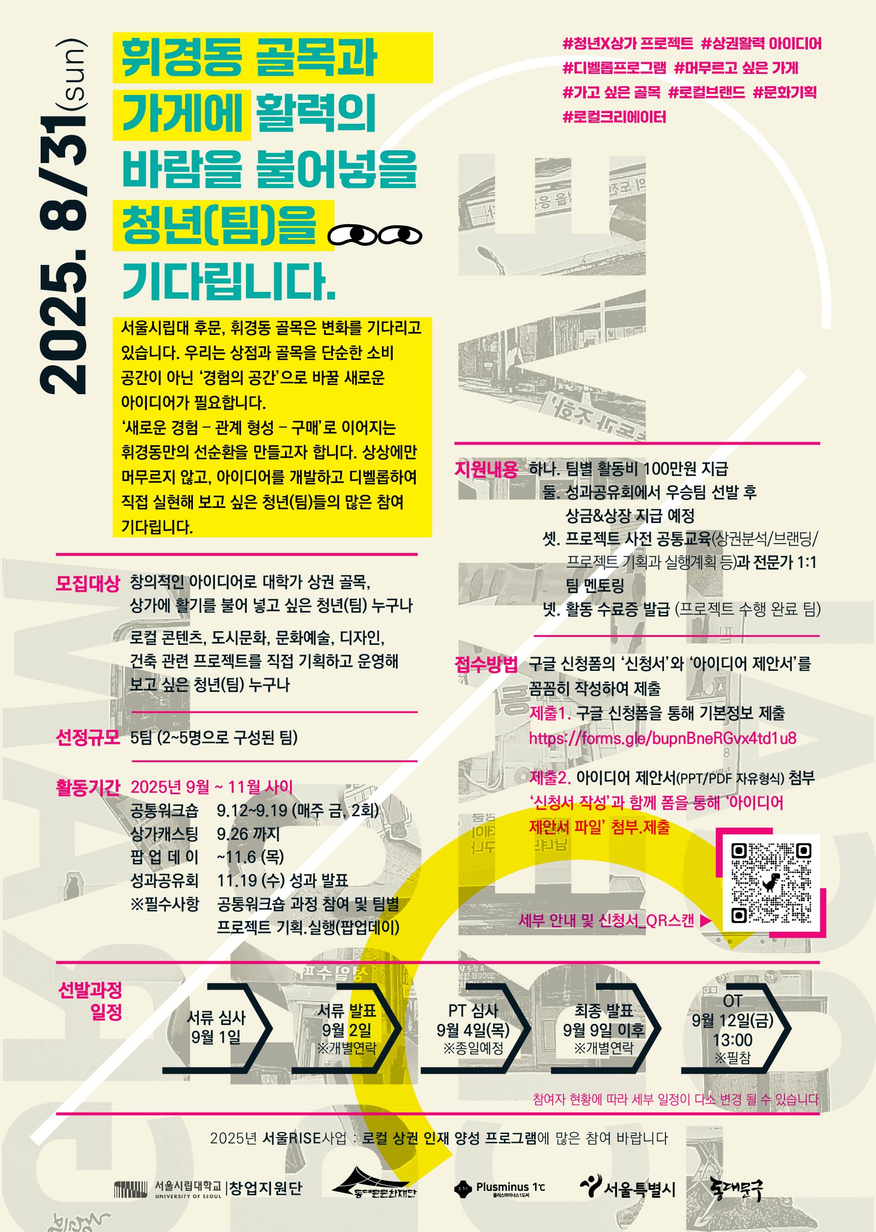✨ [³¶¸¸·Î ÈÖ°æ ½ÃÁð2 – ±â¾ïÀ» ÆÄ´Â °ñ¸ñ] û³â Âü¿©ÆÀ ¸ðÁý ✨ ¼¿ï½Ã¸³´ë ÈĹ®, Èְ浿 °ñ¸ñ¿¡ Ȱ·ÂÀ» ºÒ¾î³ÖÀ» û³âÆÀÀ» ã½À´Ï´Ù! »ó»ó¿¡¼ ±×Ä¡Áö ¾Ê°í, ¾ÆÀ̵ð¾î¸¦ ¹ßÀü½ÃŰ°í ´Ù½Ã ã°í ½ÍÀº °ñ¸ñ, ¸Ó¹«¸£°í ½ÍÀº °¡°Ô°¡ ÀÖ´Â µ¿³×¸¦ ¸¸µé û³â(ÆÀ)µéÀ» ¸ðÁýÇÕ´Ï´Ù. ❗️¸ðÁý±â°£ : 2025. 8. 18.(¿ù) ~ 2025. 8. 31.(ÀÏ) ÀÚÁ¤±îÁö ❗️¸ðÁý´ë»ó : ¸¸ 19¼¼ ÀÌ»ó~ 39¼¼ ÀÌÇÏ Ã»³âÀ¸·Î ±¸¼ºµÈ ÆÀ(2ÀÎ ÀÌ»ó Âü¿© °¡´É) ❗️Áö¿ø³»¿ë - ÆÀº° Ȱµ¿ºñ 100¸¸¿ø Áö¿ø - Àü¹®°¡ ¸àÅ丵 ¹× ¿öÅ©¼ó 2ȸ - ¼º°ú°øÀ¯È¸ ÁøÇà ¹× ¿ì½ÂÆÀ »ó±Ý, »óÀå ¼ö¿© µî 👉 Á¢¼ö¹æ¹ý : https://forms.gle/dGKKEC6bbDZsqbv9A ¡Ø ÀÚ¼¼ÇÑ »çÇ×Àº ÷ºÎ¹®¼ÀÇ ¸ðÁý °ø°í¹®À» È®ÀÎÇØÁÖ¼¼¿ä ¡Ø À̹ÌÁö¸¦ Ŭ¸¯ÇÏ¸é ½ÅûÆäÀÌÁö·Î À̵¿ÇÕ´Ï´Ù.
