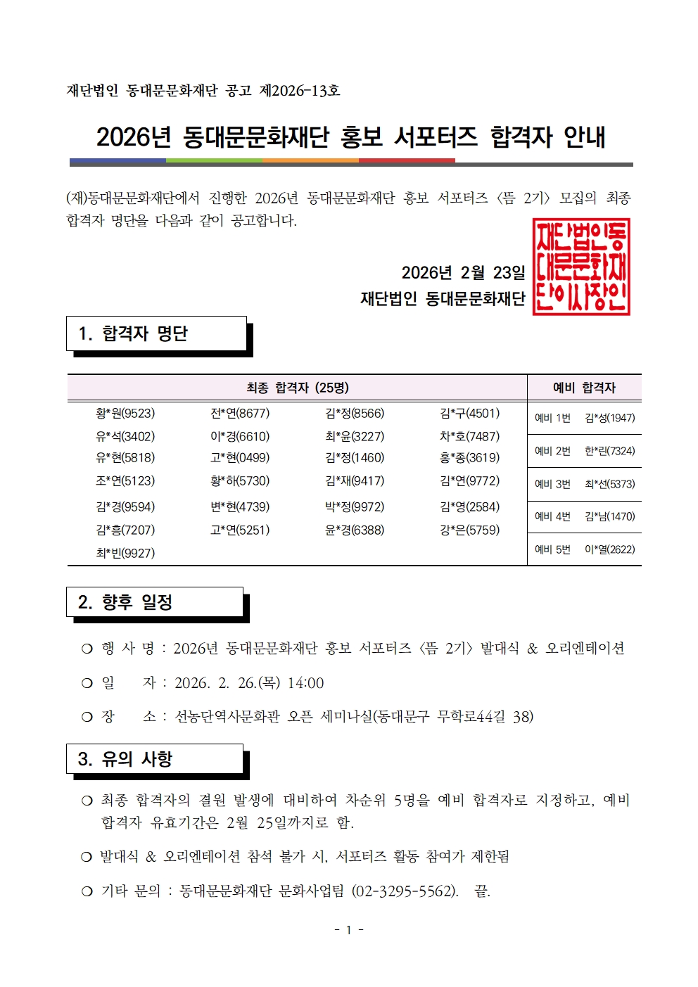 2026³â µ¿´ë¹®¹®ÈÀç´Ü È«º¸ ¼Æ÷ÅÍÁî <¶ä 2±â> ÇÕ°ÝÀÚ ¾È³»
